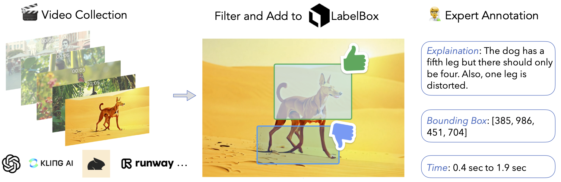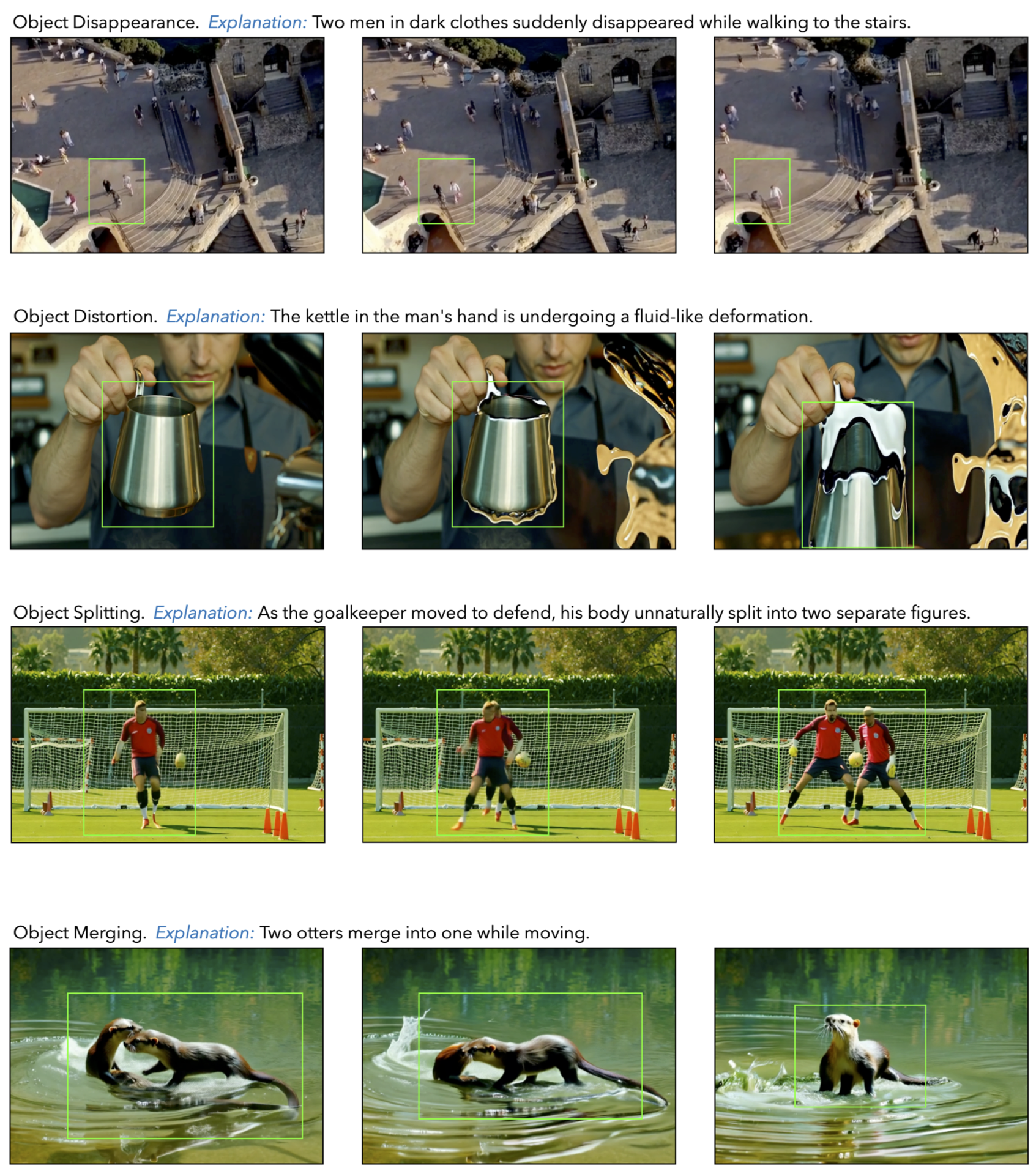 The second criterion comes from our initial observations, that most retained videos after manual filtering depict dynamic scenes involving object or human movement. This bias is deliberate: artifact patterns such as unnatural trajectories, object distortions, and sudden blurring are far more likely to emerge in motion-rich scenarios than in static scenarios, which rarely exhibit consistent visual anomalies. These insights guide our video selection and annotation strategy, which prioritizes movement-centric contexts where fake clues are more prevalent.