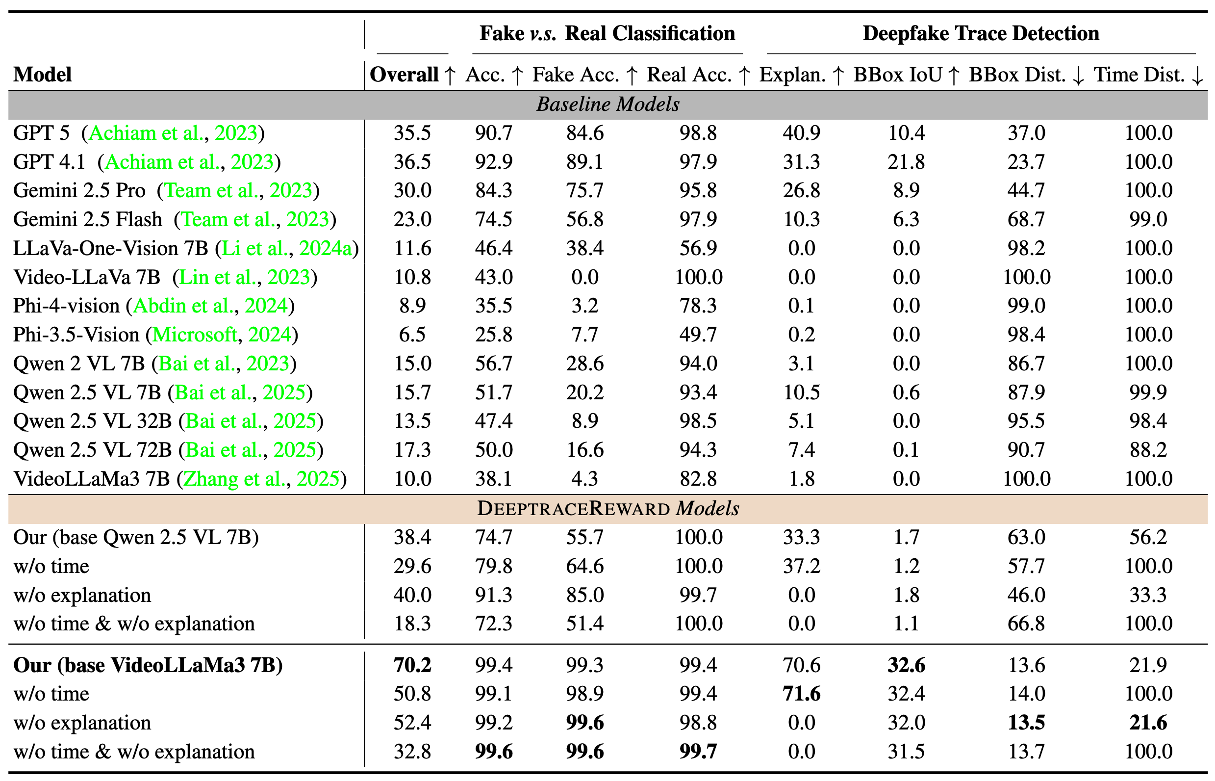 Interestingly, we observe a consistent difficulty gradient: binary fake v.s. real classification is substantially easier than fine-grained deepfake trace detection; within the latter, performance degrades from natural language explanations (easiest), to spatial grounding, to temporal labeling (hardest). By foregrounding human-perceived deepfake traces, DEEPTRACEREWARD provides a rigorous testbed and training signal for socially aware and trustworthy video generation.