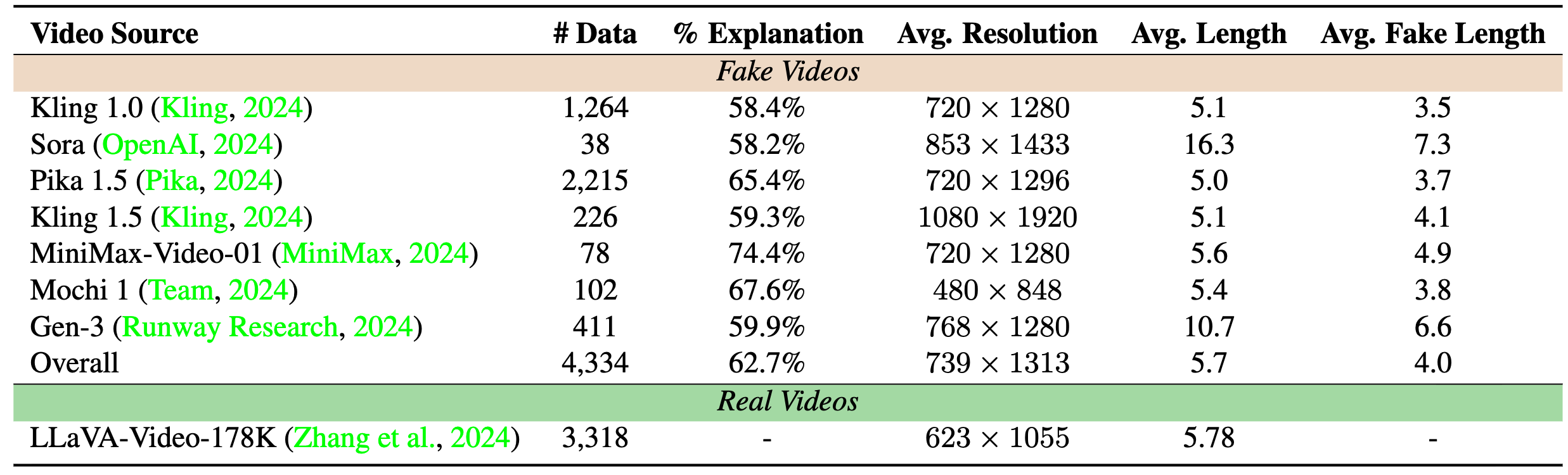 The dataset consists of 4,334 fake videos generated by six state-of-the-art T2V models and 3,318 real videos sourced from LLaVA-Video-178K (Zhang et al., 2024) for training. For both sources, we report: the number of videos, the proportion with human-written explanations, average resolution (mean height and width), average video length (seconds), and average length of annotated fake clues (based on start/end timestamps). The dataset features substantial diversity in both resolution and temporal duration across models.